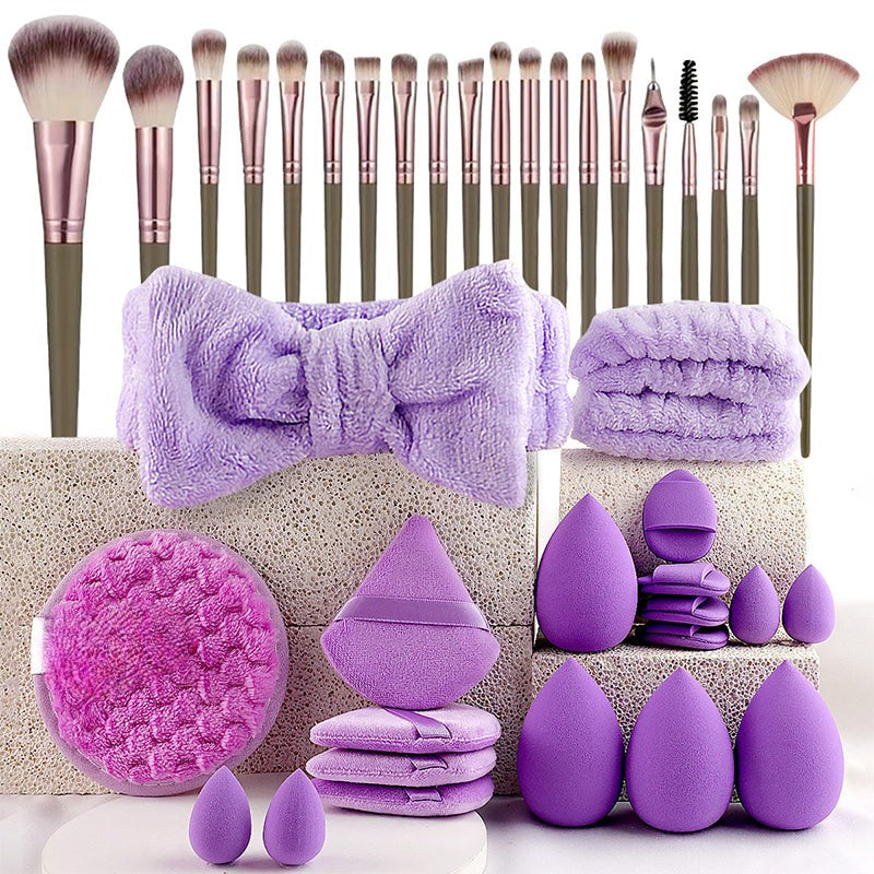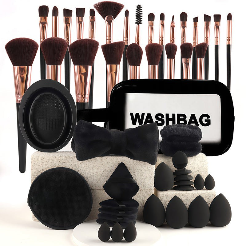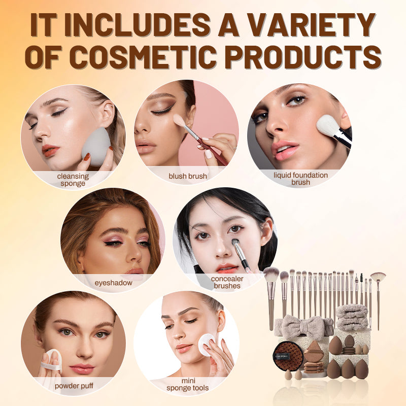 ALL-IN-ONE SET - Includes cleansing sponge, blush brush, liquid foundation brush, eyeshadow and concealer brushes, powder puff, and mini sponge tools. Designed to meet all your face cleansing and makeup application needs in one kit.