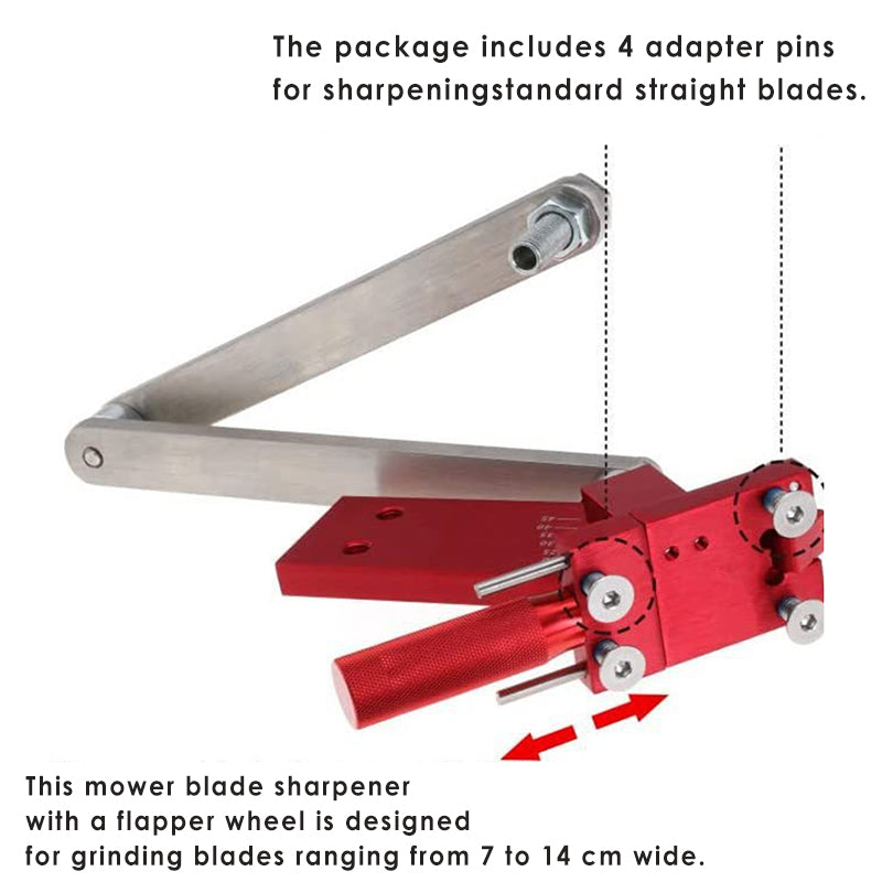 WORKS WITH MOST BLADE TYPES – This sharpener is compatible with a variety of lawn mower blades. It fits blades from 7cm to 14cm (2.7" to 5.5") wide, and with 4 adjustable pins, it holds different blade styles securely. It’s perfect for sharpening both straight and high-lift blades.