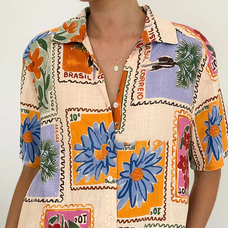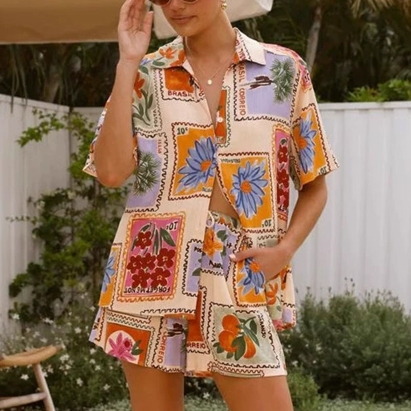 Printed Short Sleeve Shirt & Elastic Waist Shorts Set