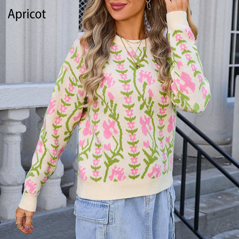 Women's Floral Knit Sweater with Crew Neck & Long Sleeves