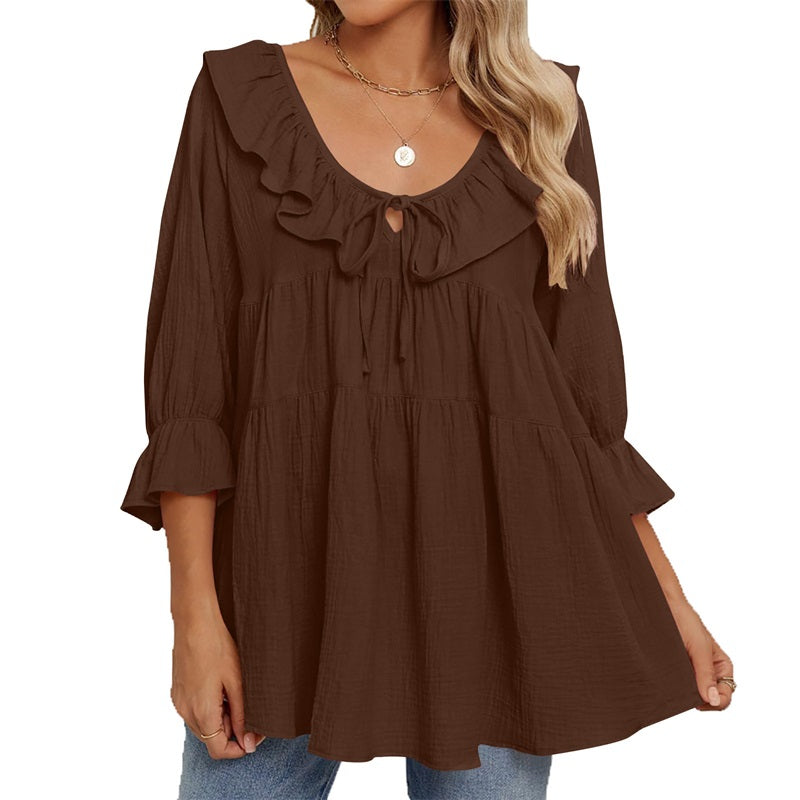 Package Includes: 1 * Women's 3/4 Sleeve Tie Front Ruffle Tiered Shirts