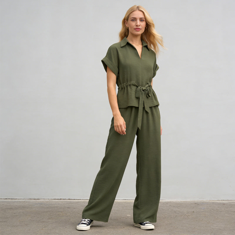 Women's Collared Drawstring Waist Top & Pants Set