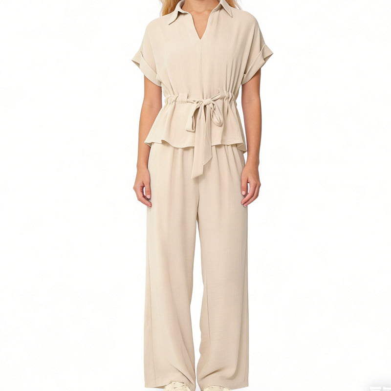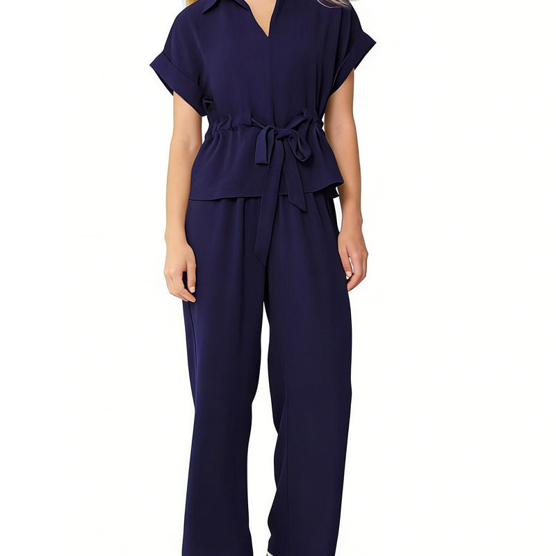 Package Includes: 1 * Women's Collared Drawstring Waist Top & Pants Set