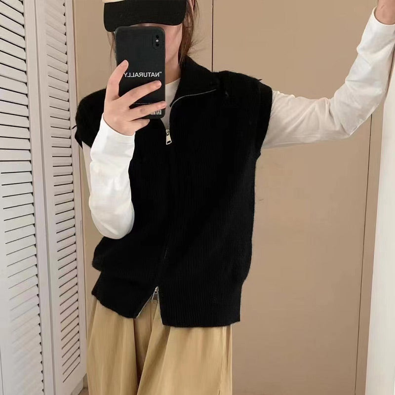 SLEEVELESS VEST DESIGN: This fashionable sleeveless vest features a classic solid color and a soft, textured fabric for timeless appeal. The zipper at the hem can be adjusted to create a trendy slit, enhancing its stylish look, perfect for early autumn.