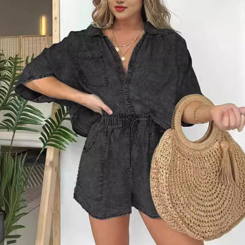 COORDINATED TWO-PIECE SET - This ensemble includes a matching pair of denim shorts, completing the effortlessly chic look. The shorts feature a comfortable elastic waistband and a flattering fit, making them perfect for all-day wear.